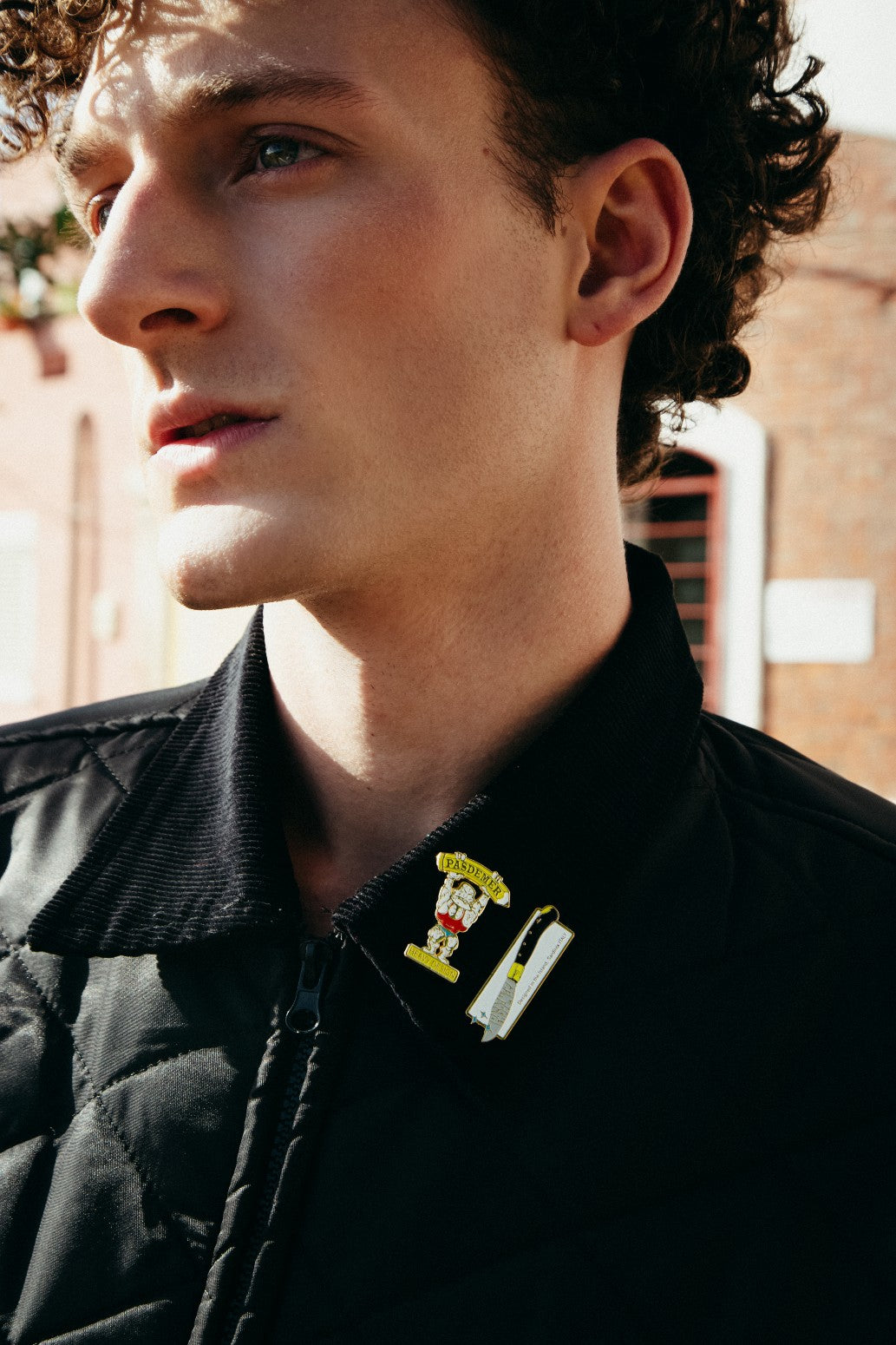 フロントにスナップ付きフラップポケットが2つ付き、襟部分にオリジナルピンが付いています。